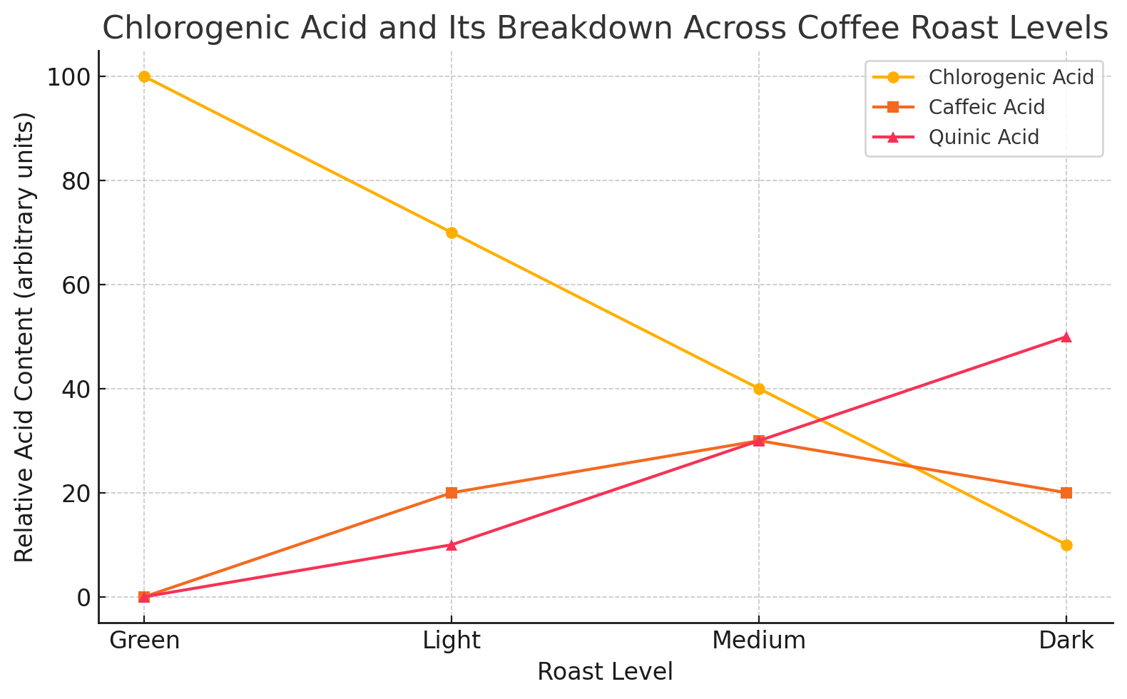 Here's a visual showing how chlorogenic acid decreases as roast level increases, while its breakdown products—caffeic acid and quinic acid—rise and change in flavor impact.